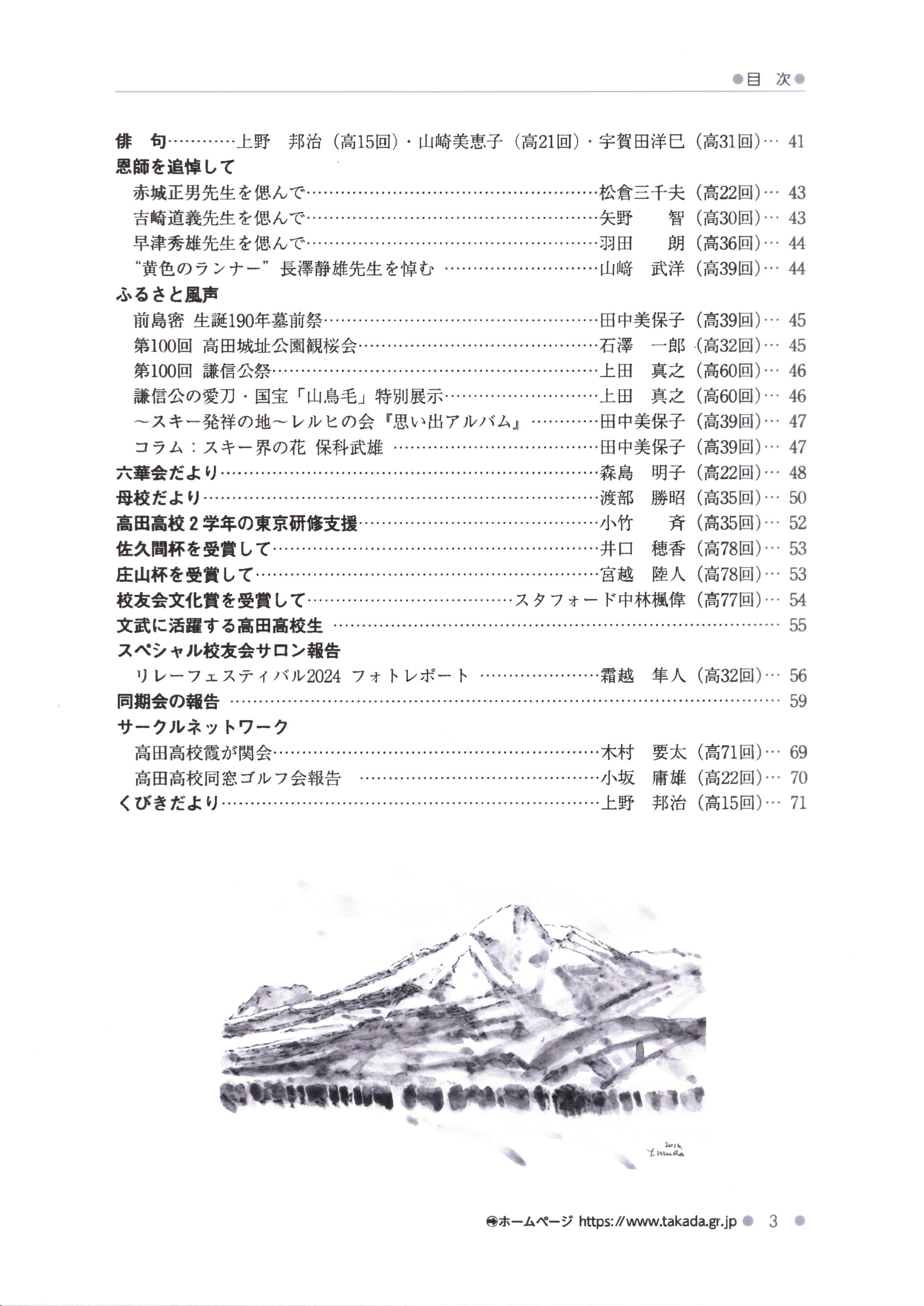 『雪椿』は、校友の有志で構成する「編集部」が、仕事の傍らボランティアで編集・発行しているものです。内容は、東京支部の1年間の活動報告はもとより、母校やふるさとのことを紹介しつつ考える「特集」など充実したものとなっています。
